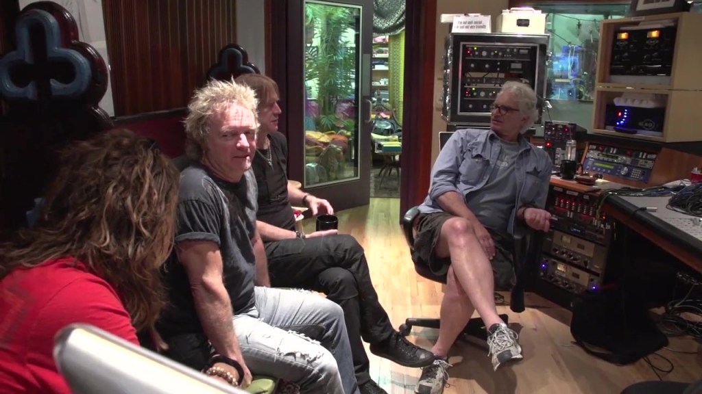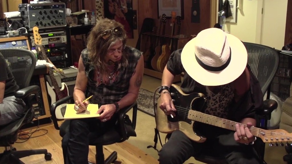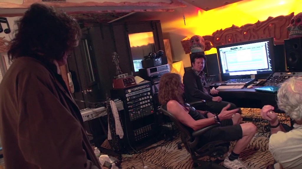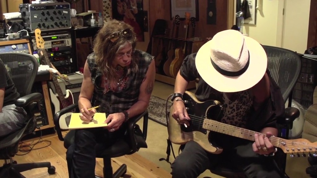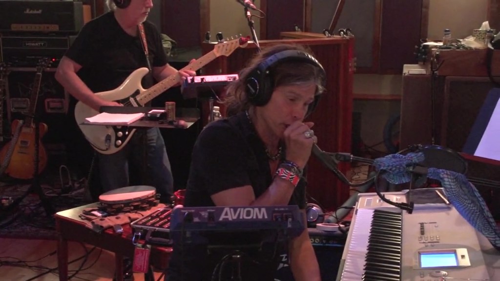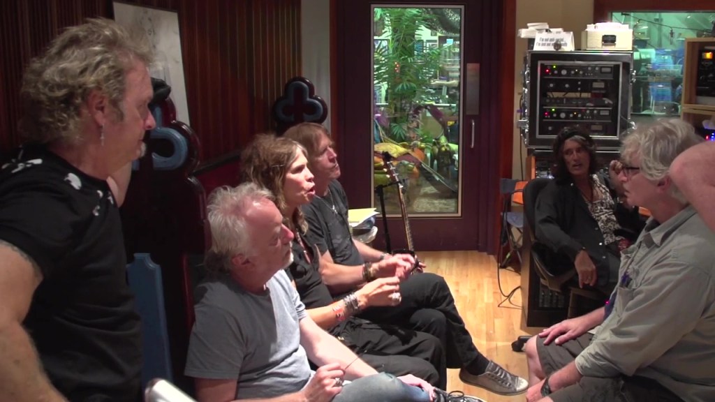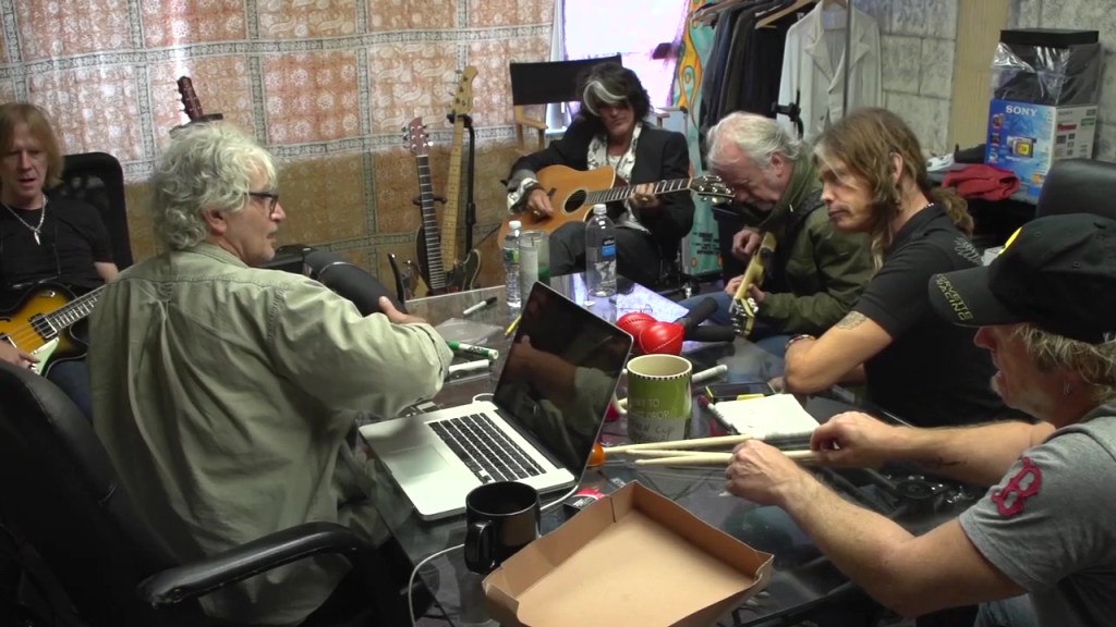 Jack Douglas on first sessions in Boston: “First is the writing process. The idea of the album was to write it and make a record that really sounds like the band. They come into my office with dry [acoustic] guitars and I have an old cassette machine and I start recording. I’m writing stuff up on a chalk board behind me, with fake titles attached to the different riffs and ideas. [Notorious Boston mobster] Whitey Bolger had just been captured so we had one song that was called ‘Welcome Home, Whitey!’ There was one called ‘Butt Weight’ [as in the late-night commercial offers that say ‘But wait!’]. There was another with the working title ‘We Know Where Your Kids Are.’ Then we would take them to the next room over, which is a bigger conference/rehearsal room where we had a piano, some small amps and their instruments, and we would record into my computer and start to work the licks up. Everybody is sitting at this big table and each guy is putting in ideas. We would work stuff up in there, record it and listen back to it for a couple of days, make changes, and as soon as it got to be a recordable song, we’d go right into the [main studio] room and cut it while it was fresh.”