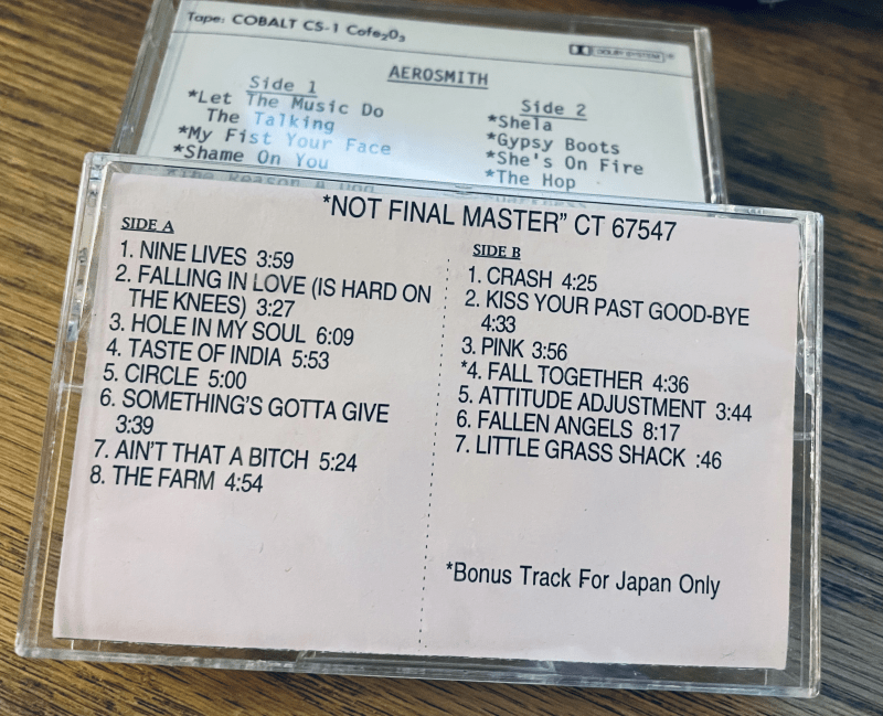A copy of the “unmastered” tracks from Nine Lives exists. The tracks are just that, not final masters of the song without substantial differences. “The Farm” has a slightly different longer ending, “Pink” features a different South Beach mix/mastering, and featured “Little Grass Shack” as the final track.