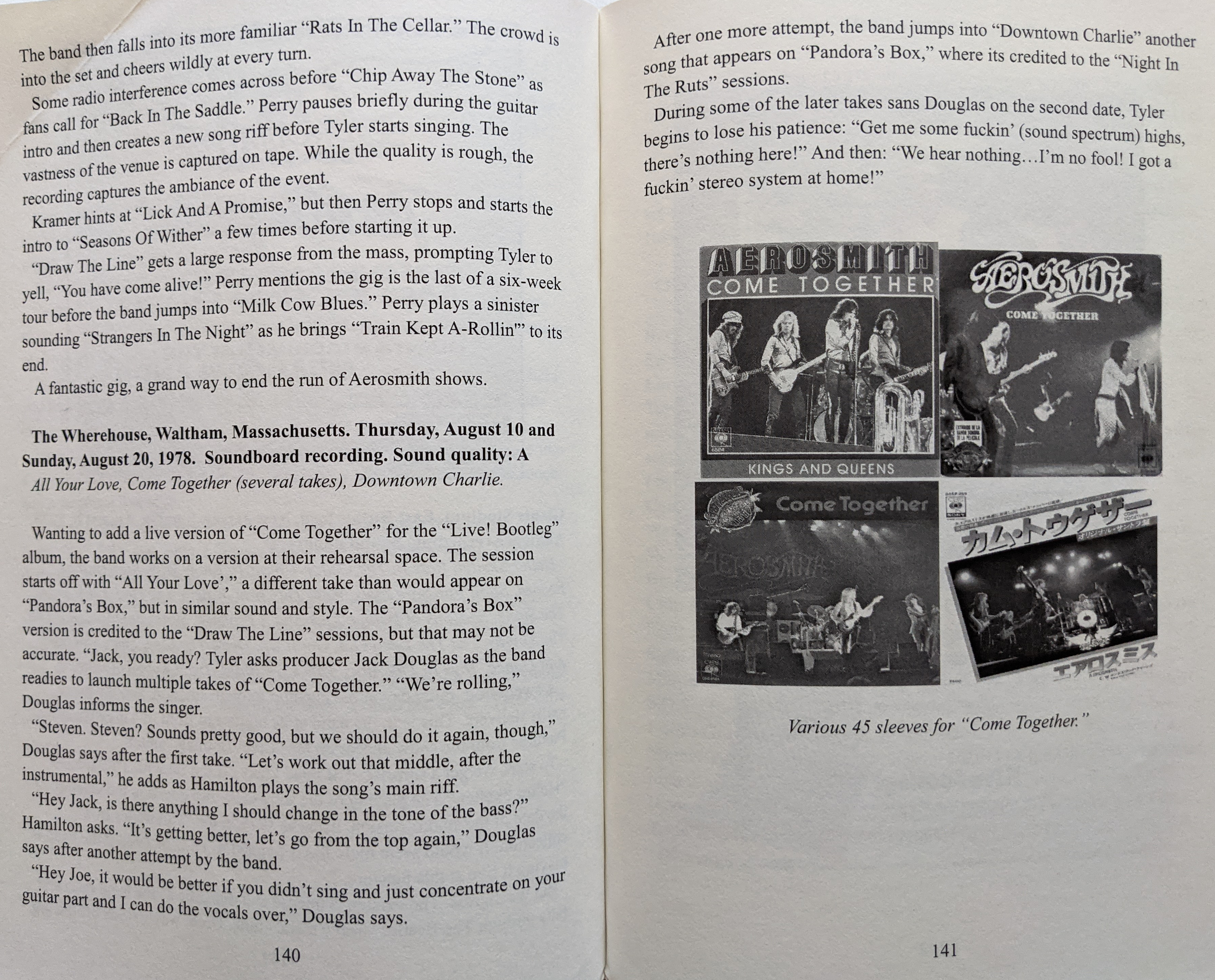 Wanting to add a live version of “Come Together” for the “Live! Bootleg” album, the band works on a version at their rehearsal space. The session starts off with “All your Love’”, a different take than would appear on “Pandoras Box”, but in similar sound and styler. The “Pandoras Box” version is credited to the “Draw the Line” sessions, but that many not the accurate. “Jack, you ready? Tyler asks producer Jack Douglas as the band readies to launch multiple takes of “Come Together”. “We’re rolling”, Douglas informs the singer.