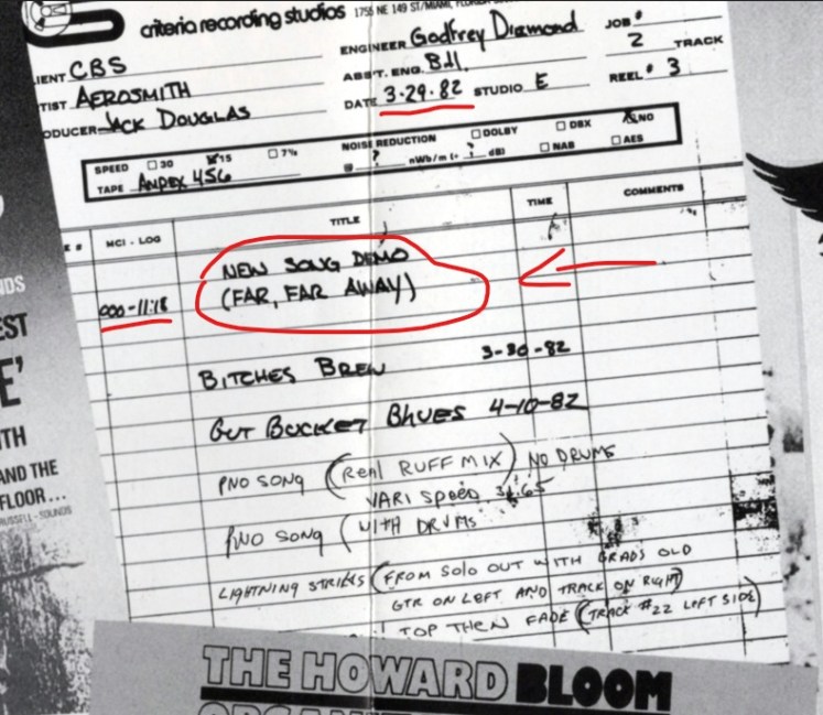 Inside the jacket of Rock in a Hard Place appears a reproduced Criteria Recording Studios reel log dated 29 March 1982, Studio E, listing Aerosmith with Jack Douglas producing during the Miami sessions that ultimately shaped the album. On that sheet, among the handwritten entries in the title column, is a line that reads “NEW SONG DEMO (FAR, FAR AWAY).” Iit sits as a discrete entry on the reel, just like the other titled items logged on subsequent days, which suggests this was not a generic note about the reel containing demos, but rather the working identifier of a specific piece recorded that day.
