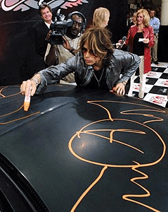 On July 12, 2001, the band took a day off from the tour to visit DaimlerChrysler’s Technical Center in Auburn Hills, Michigan. More than 1,500 employees turned out, standing three and four deep around the railings and lining the escalators. Just Push Play tracks echoed off the ceiling of the Pentagon-sized building’s covered plaza. The crew wore black T-shirts reading “July 12, 2001. Live, Aerosmith does Dodge at DCX.” Tyler spray-painted another all-black Ram on site, then the band was whisked to the test track out back to drive Vipers and preview the 2003 Viper RT. An AP photo by Duane Burleson of Tyler writing “Aerosmith” on the hood of the Ram became Photo of the Day on Canada’s Canoe entertainment network.